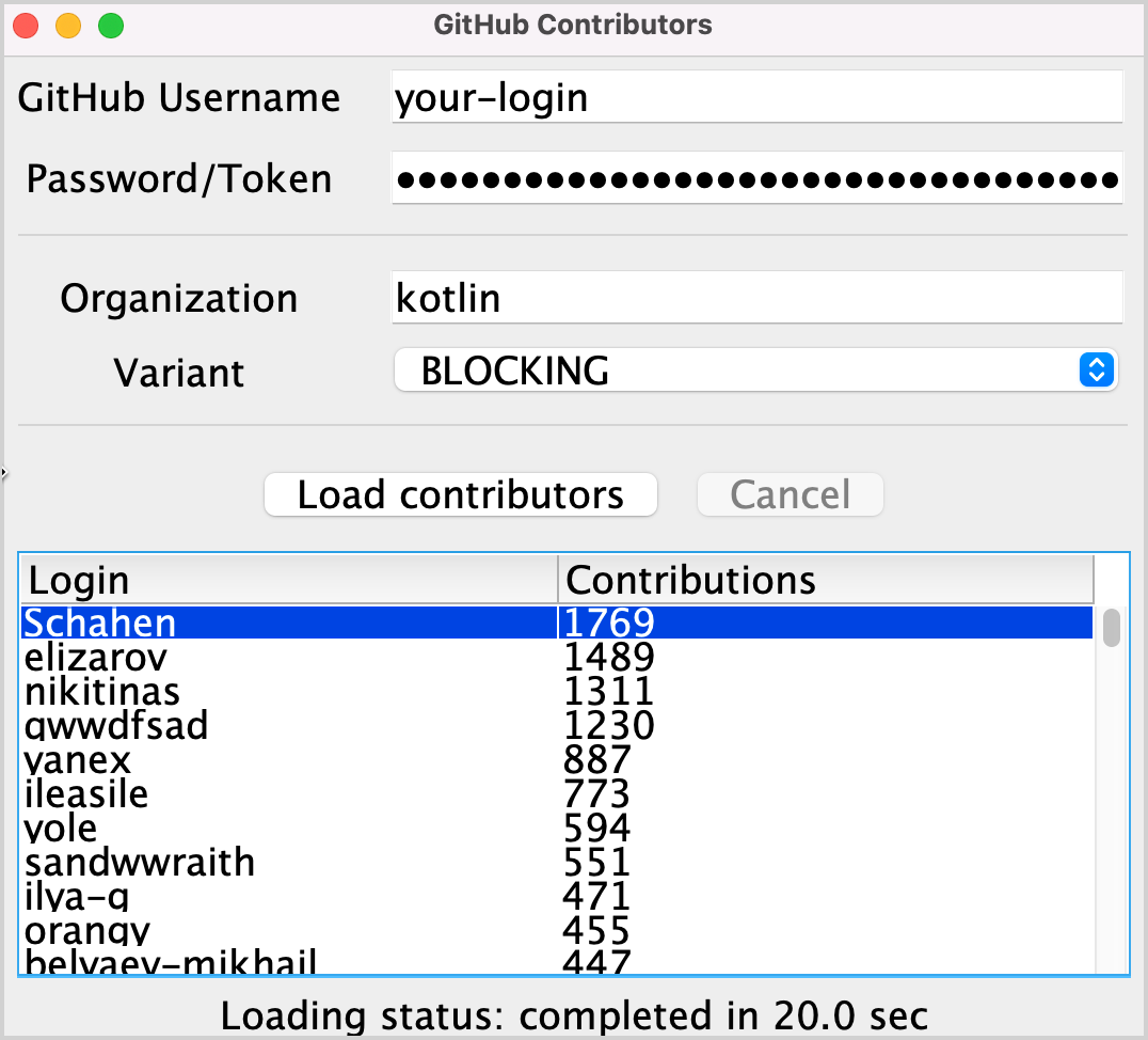 The program loads the contributors for all of the repositories under the given organization (named “kotlin” by default). Later you'll add logic to sort the users by the number of their contributions.