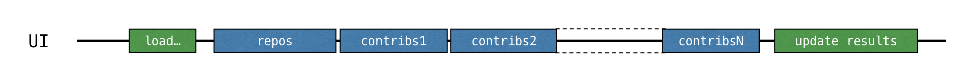 Despite the information for some repositories being loaded rather quickly, the user only sees the resulting list after all of the data has been loaded. Until then, the loader icon runs showing the progress, but there's no information about the current state or what contributors are already loaded.